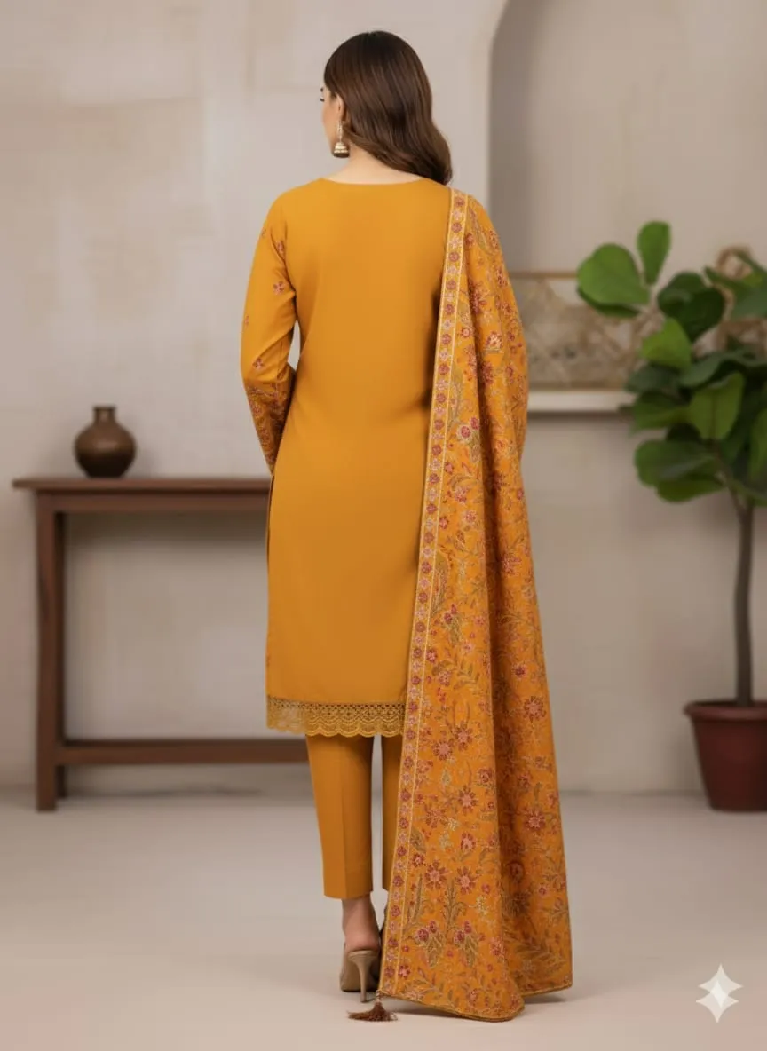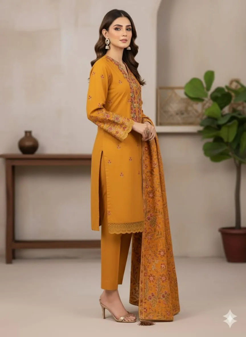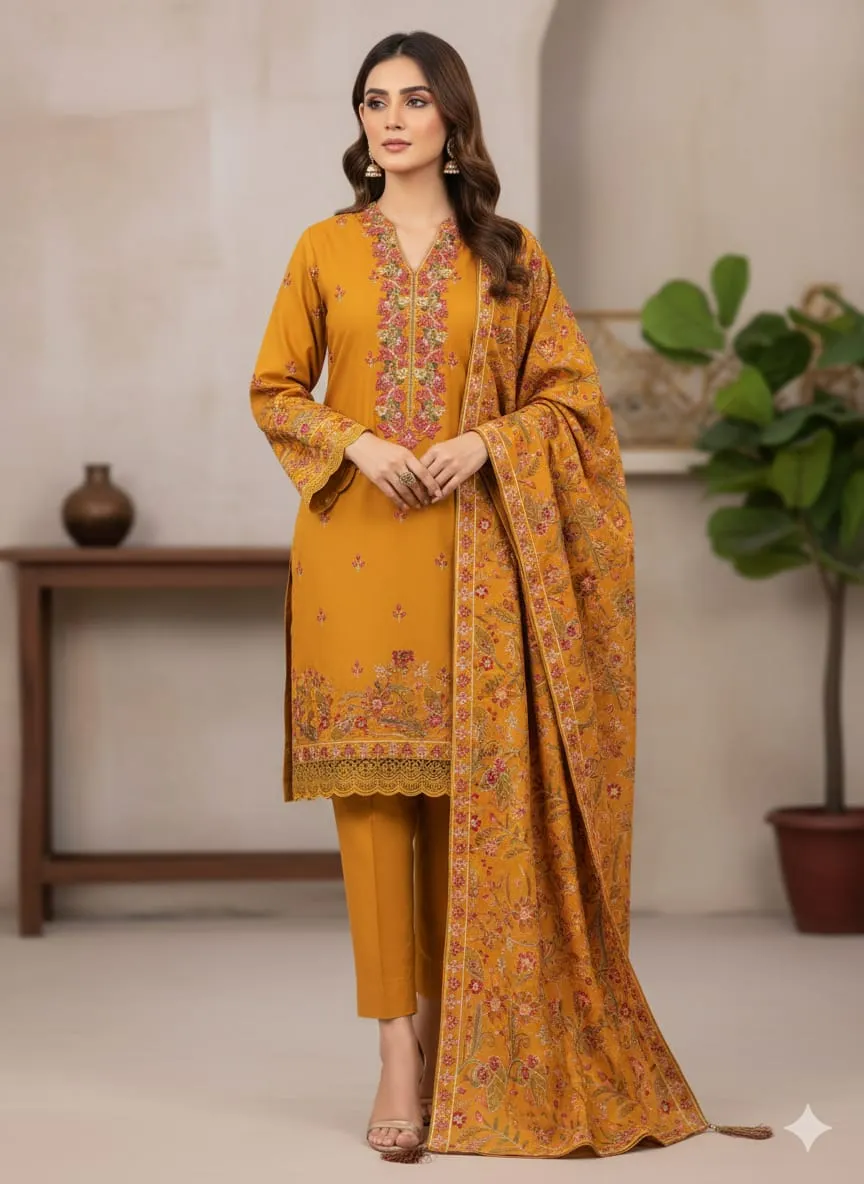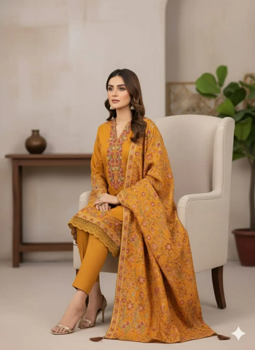 Introducing Marigold, a warm and elegant 3-piece Dhanak suit crafted to bring charm and comfort to your winter and semi-formal wardrobe.